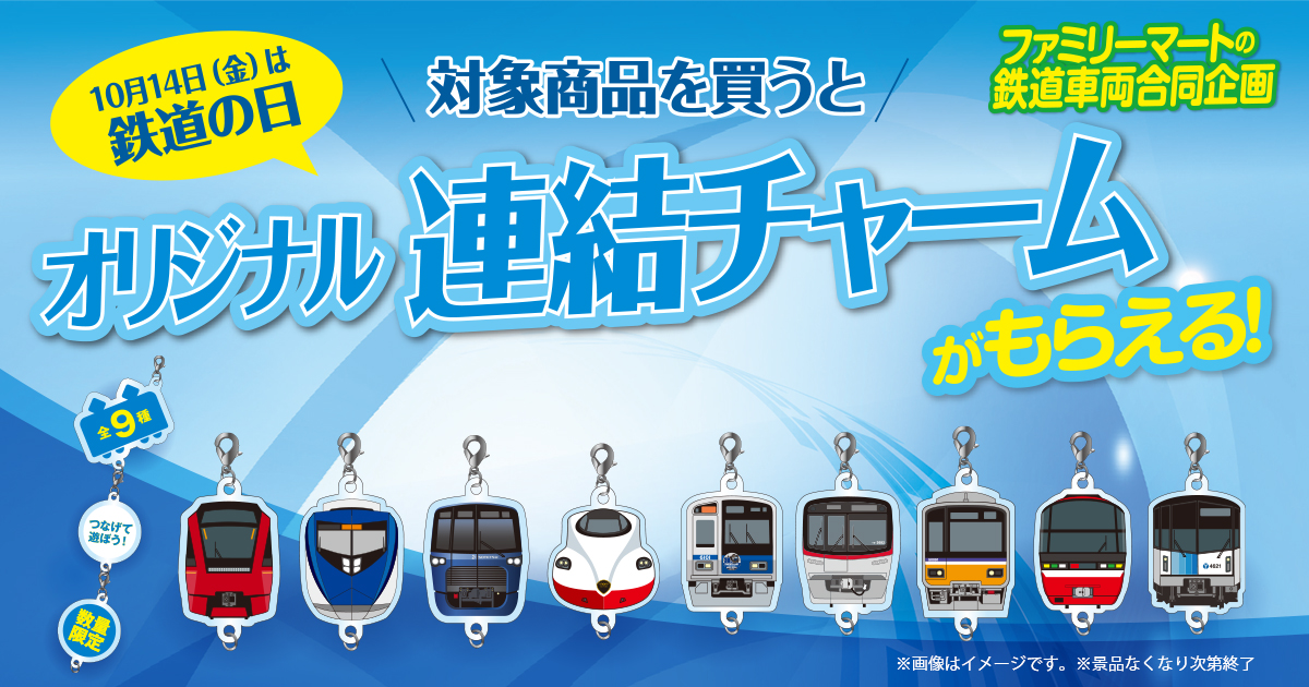 対象のペットボトル飲料を購入すると、ファミリーマートが提携する鉄道会社9社の人気車両をデザインした「オリジナル連結チャームがもらえる!」キャンペーンを実施いたします。※なくなり次第終了
